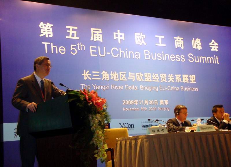 第五届中欧工商峰会由中国商务部和欧盟委员会主办,共有来自欧盟国家和中国的600多位中外企业家参加会议,是在江苏举办的规格最高的国际活动。国务院总理温家宝在全体会议上发表了题为《发展绿色经济,促进持续增长》的主旨演讲。欧盟轮值主席国瑞典首相赖因费尔特、欧盟委员会主席巴罗佐也在全体会议上发表了演讲。