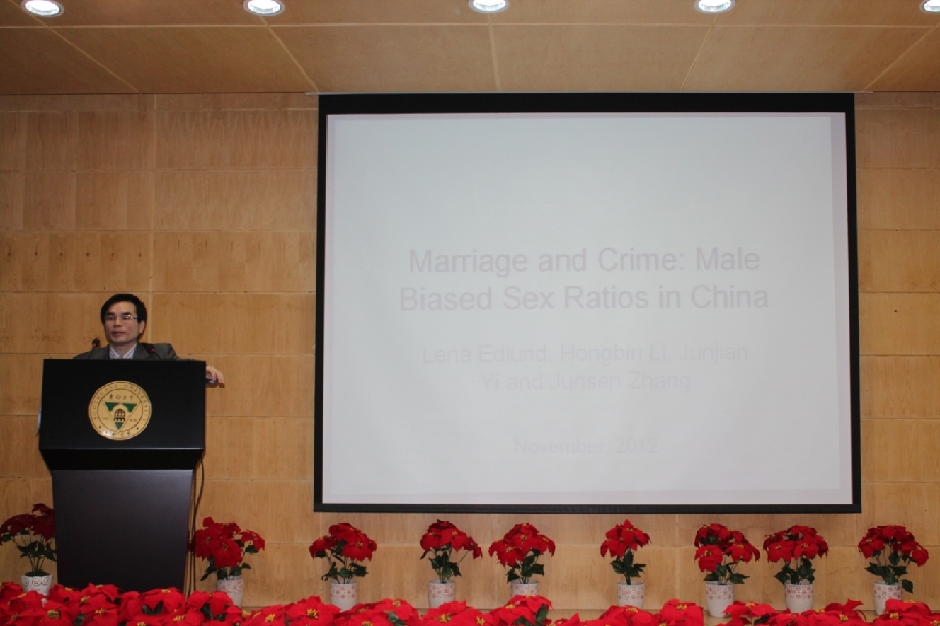刘波书记代表电影天堂 致辞,介绍了张俊森教授的主要成就并为张教授颁发聘书、佩戴校徽,现场气氛热烈。受聘仪式结束后,张教授做了题为“Marriage and Crime: Male Biased Sex Ratios in China”的学术报告。张教授将现实观察与经济理论相结合,用严谨的经济学方法探讨中国男性比例偏高对婚姻市场与犯罪行为的影响,得出了很多有趣的结果。张教授先从上世纪50年代以来中国男性比例不断攀升的事实出发,解释可能导致这一现象的原因。然后提出理论模型与假设,并用中国数据进行检验。结果发现,16-25岁的人口中,男性比例偏高,会导致犯罪率的攀升;在婚姻市场中,男性单身的概率更高,在已婚男性中,他们的配偶会更年轻且收入更低;在家庭内部,男性可能会从事更多的家务,女性则可能拥有更多的决策权;在劳动力市场上,男性可能会接受更多的教育,同时更可能失业,不过一旦就业则能获得更高的工资。张教授热情洋溢、生动诙谐的演讲吸引了在场所有的师生。本次受聘仪式暨学术报告会在一片热烈的讨论中圆满结束。