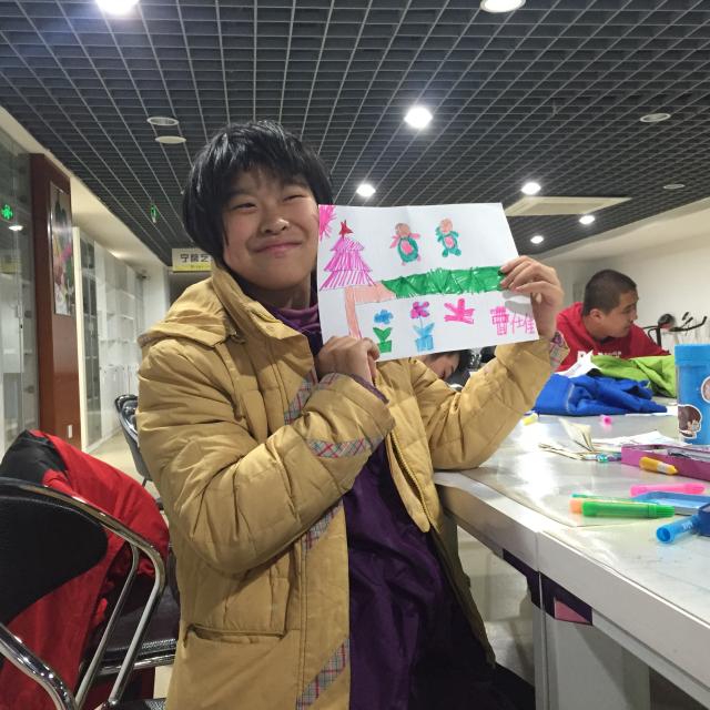 陪着他们一起画画,画冬天,画雪人,画打雪仗的孩子,画美丽的圣诞树。有的孩子默默地一个人图绘他们的色彩,有的孩子兴奋地到处找志愿者欣赏他们的艺术成果。纸上是他们眼里的冬天,脸上是我们眼中的笑靥。