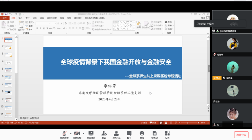 自2010年以来金融安全在我国已成为一个非常重要的话题。我国正处于进一步金融开放金融的关键时期,面对疫情冲击,维护金融安全异常重要却又困难重重。李绍芳老师围绕“全球疫情背景下我国金融开放与金融安全”,给全体与会党员分析了当前金融形势、相应政策以及应对的举措。