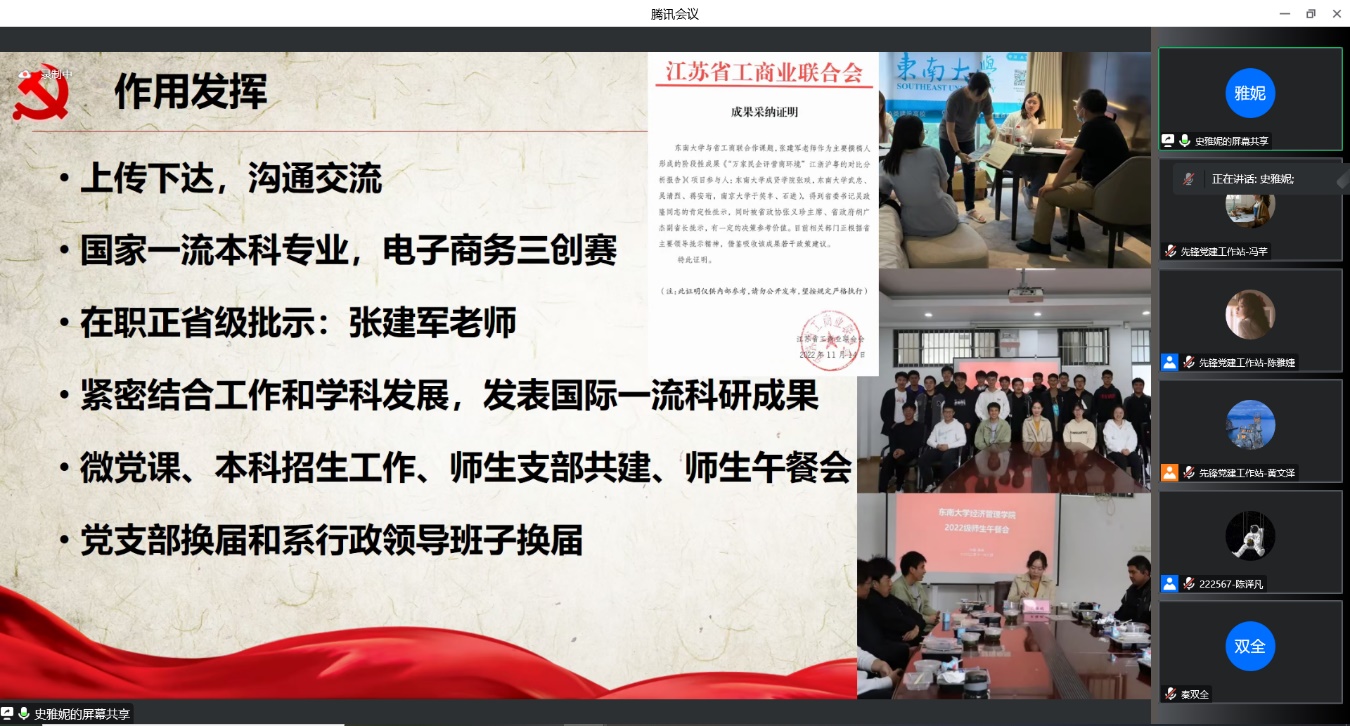金融系党支部书记尹威老师分享了支部如何以二十大精神为主线,开展具有经管特色的党建活动,通过师生共建、校企共建提升党建工作辐射面和影响力。