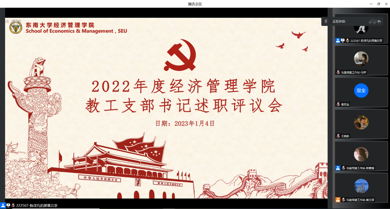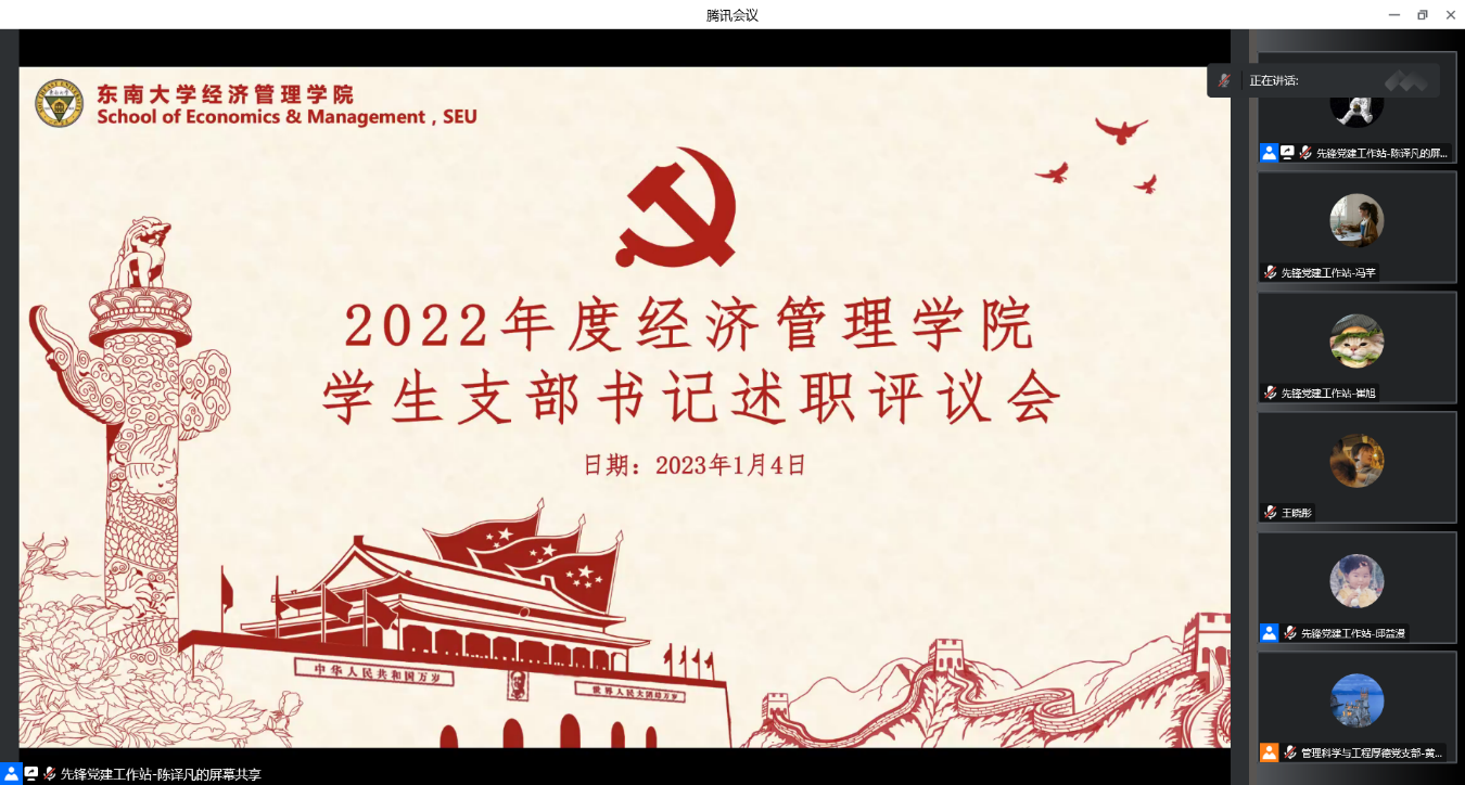1月4日,电影天堂 2022年度全院支部书记述职会议在腾讯会议线上顺利召开。学院党委书记袁健红老师、党委副书记兼副院长何熠老师、全体教工、学生支部书记以及辅导员代表等出席。会议由先锋党建工作站陈译凡同学主持。