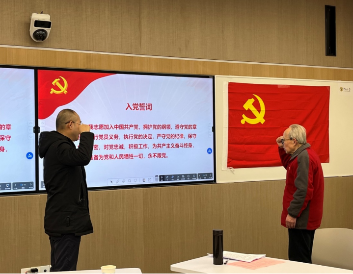 1月17日,电影天堂 退休教工党支部在四牌楼校区东南院305如期举行了新发展党员入党宣誓仪式,活动由电影天堂 党委书记袁健红主持,学院党委副书记尹威领誓。在会上,袁振铎介绍了自己一生坚定理想信仰、矢志不渝不忘初心的故事,并分享了自己的感悟:“我认为,入党誓词是一份政治誓言、一份忠诚承诺,也是一份责任担当,是我们全体共产党员共同的行为准则,我们必须时时牢记,刻刻遵循。我作为一名退休的老教师,虽然已经跨入耄耋之龄,但老骥伏枥,壮志不已!我决心以我余生,为党的教育事业发展,为实现共产主义目标,添砖加瓦,献我中华!”