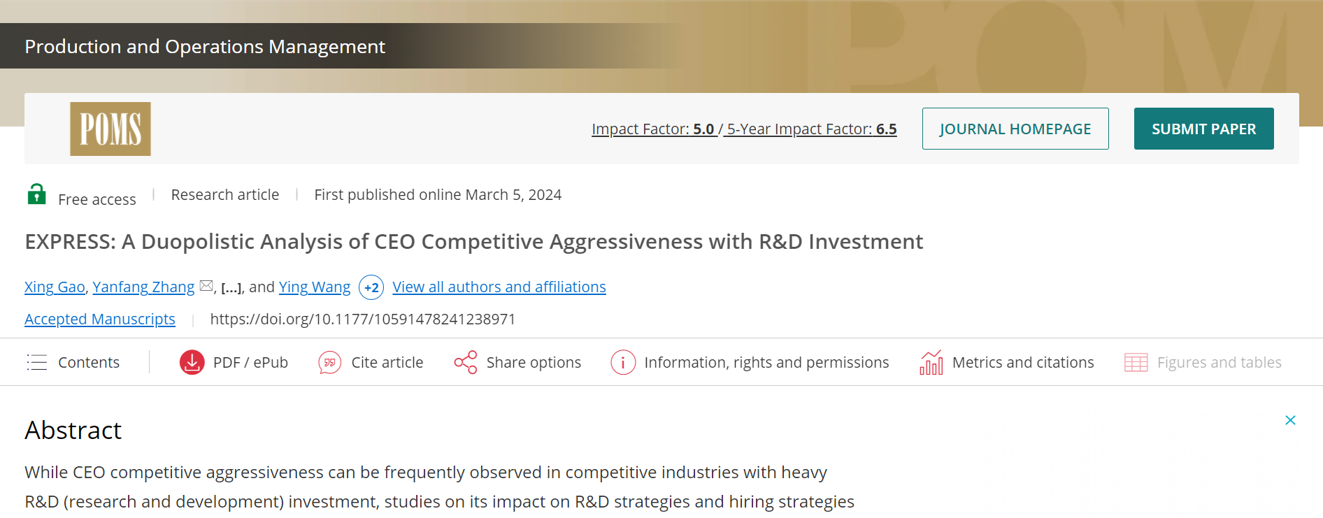 近日,电影天堂 高星老师课题组2021级管理科学与工程专业硕士研究生王惜凡、物流工程与管理专业硕士研究生王颖与合作者在管理学国际顶级期刊《Production and Operations Management》上在线发表学术论文“A duopolistic analysis of CEO competitive aggressiveness with R&D investment”。据悉,《Production and Operations Management》(POM)是全球公认的UT DALLAS商学院24种国际顶级期刊(UTD24)之一,以其在运筹管理领域的突出影响力著称。