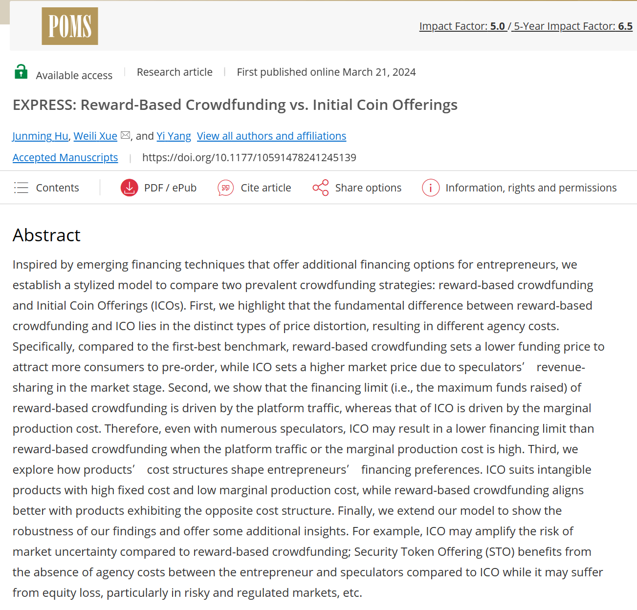 物流管理工程系薛巍立老师与合作者围绕数字化平台运营管理在UTD24期刊《Production and Operations Management》在线发表学术论文“Reward-Based Crowdfunding vs. Initial Coin Offerings”。