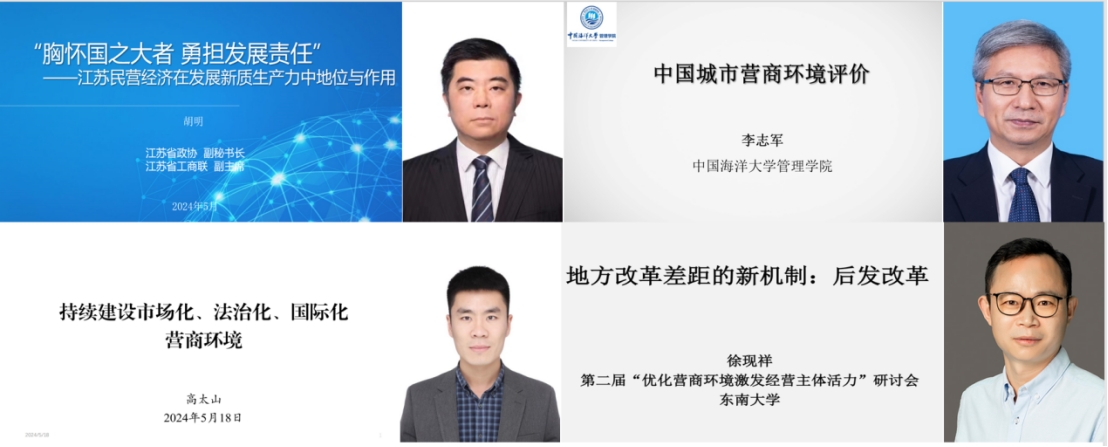 18日上午,江苏省政协副秘书长胡明教授、中国海洋大学李志军教授、国务院发展研究中心企业研究所高太山研究员、中山大学岭南学院徐现祥教授、浙江大学邬爱其教授分别做了题为“胸怀国之大者,勇担发展责任——江苏民营经济在发展新质生产力中地位与作用”、“中国城市营商环境评价”、“持续建设市场化、法治化、国际化营商环境”、“地方改革差距的新机制:后发改革”、“营商环境优化与区域专精特新企业活力”的精彩演讲。