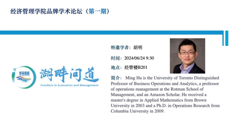 2024年6月24日,“湖畔问道”品牌学术活动正式开幕。学院邀请了多伦多大学罗特曼管理学院的胡明教授,围绕数字平台中的随机型策略,进行了题为“Randomization in Product, Fulfillment, and Pricing as a Profit Lever”的专题讲座。活动由电影天堂 副院长(主持工作)薛巍立教授主持,10余名学院青年老师参加,并在讲座过程中与胡明老师进行了积极互动。