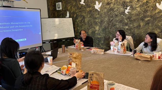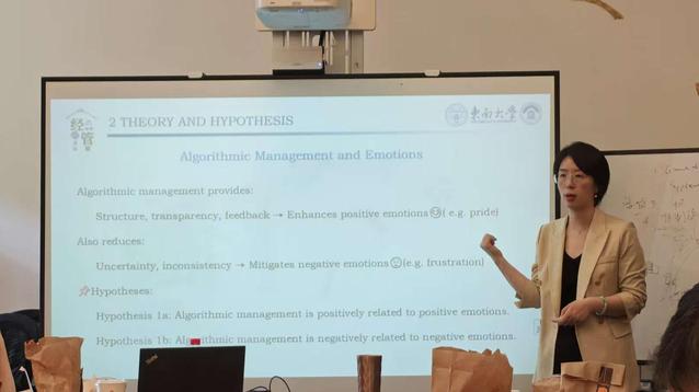 随后,许勤老师以“The Effect of Algorithmic Management on Gig Workers’ Safety Behavior and Life Satisfaction:An Affective Events Perspective”为主题,详细介绍了团队的最新科研成果。算法管理是指使用编程算法执行核心管理功能(如监控、调度、目标设定、绩效评估和补偿),广泛应用于打车和送餐等零工平台,旨在提高效率和降低劳动力成本。许勤老师从算法管理对工作者福祉(尤其是安全行为和生活满意度)影响的角度出发,针对405名中国外卖员,进行为期三阶段的调查,研究得出算法管理能够通过增加积极情绪和减少消极情绪来提升零工工作者的生活满意度并提高安全指数,同时零工工作者身边的社交支持能够显著缓解负面情绪。许勤老师的研究丰富了算法管理的相关研究,强调了情感事件理论在数字劳动中的应用价值,有利于精进更加情感智能的算法系统设计。与会师生围绕积极情绪的衡量维度、收入或政策变化等特殊因素对外卖工作者的影响展开了热烈讨论,为后续研究提供了新的思路。现场气氛轻松活跃,学术交流细致深入,充分展现了跨学科对话的魅力。