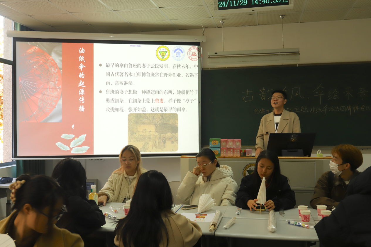 活动的最后,各组同学纷纷上台展示自己的油纸伞,分享了设计思路和创作历程,并阐述了作品中蕴含的对于党史精神的理解。