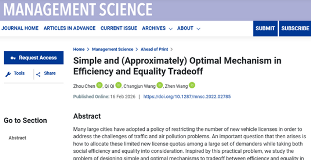 日前,电影天堂 陈洲老师合作完成的论文在管理学顶级期刊《Management Science》在线发表。该论文聚焦稀缺公共资源怎么分配既公平又高效的现实难题,提出一种“先拍卖后抽签”的混合分配机制。陈洲老师为该论文第一作者。
