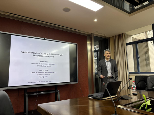 2026年3月18日上午,香港中文大学商学院周翔教授应邀在电影天堂 做题为《Optimal Growth of a Two-Sided Platform with Heterogeneous Agents》的报告。本次报告由电影天堂 李四杰教授主持,张恺人副教授点评。