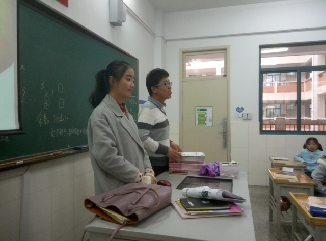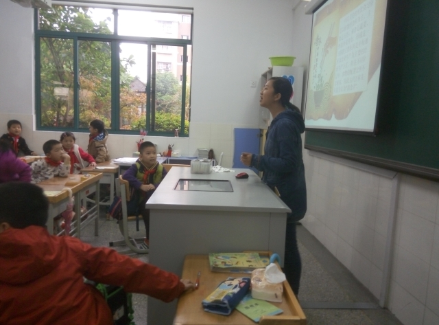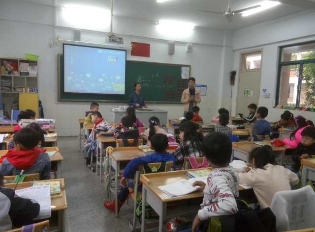 四名志愿者分成两队,在学校相关负责人的带领下,去到了各自负责的班级。天真活泼的孩子们对新来的老师充满了好奇,每个人都有好多话想说,但是很遗憾因为时间限制难以让他们一一陈述自己内心的想法,这导致志愿者们用了不少时间来维持课堂纪律。慢慢的,课堂气氛开始走入正轨,同学们都开始认真地聆听老师们的讲解,老师们也都慢慢进入了状态,开始了他们精彩的的教学过程。这时小朋友们也被教学内容吸引了,志愿者们用小朋友们最喜欢也最喜欢的各色美食为引,带领他们进行了一次中国饮食文化之旅,小朋友都兴致勃勃也收获匪浅。最后,伴随着下课铃的响起,幻灯片的放映也到了结尾,志愿者们不得不向小朋友们说再见,小朋友们亦不舍地向志愿者们挥手告别。