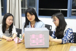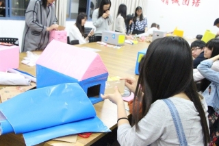 晚上七点活动正式开始,首先由负责人宣布活动开始并讲解了“流浪猫之家”猫咪屋制作基本流程及注意事项。随后,工作人员给每个小组发放了防水贴纸、保护膜、剪刀、宽胶带等制作工具。拿到工具后,小组成员相互协作,发挥创造力,制作出了形状各异、色彩丰富的猫咪屋。