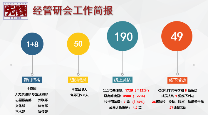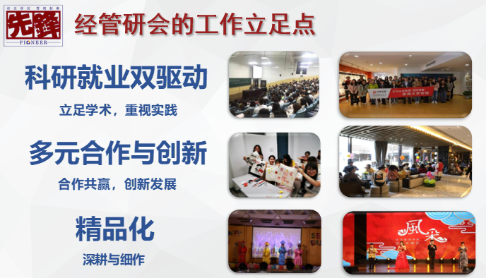 经管研会始终秉持先锋精神,坚持创新与传承,全心全意为研究生同学们服务的理念,围绕“科研就业双驱动、多元合作与创新、精品化” 三个关键词展开活动。