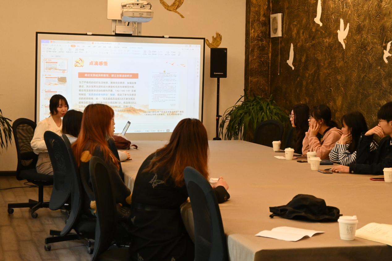 在接下来的支书面对面环节中,薛天怡学姐向我们分享了党支部建设和活动开展情况,在支部纪律和支部氛围方面向我们进行了经验分享。