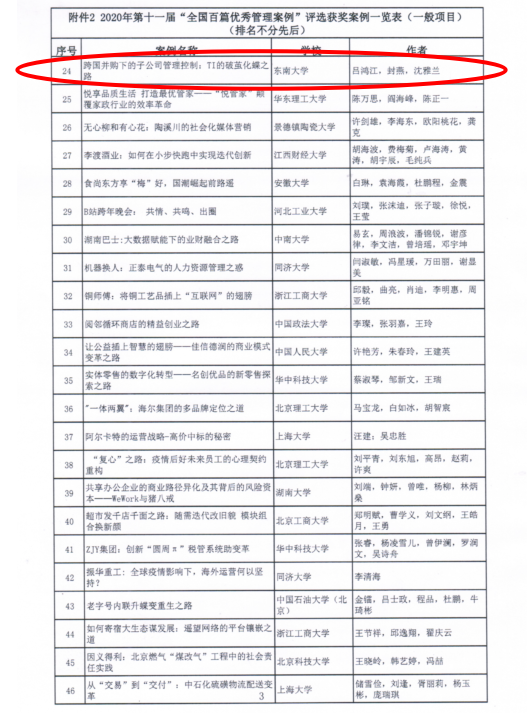 Congratulations to the case written by Professor Lv Hongjiang, Deputy Dean of the School of Economics Management, and his team, "The Management Control of Subsidiaries under Cross-border Mergers Acquisitions: TI's Bottleneck Breakthrough", and the case written by Assistant Professor Zhou Lulu, the Minister of the Case Center, and her team "Do It Properly or Do It Vainly: The Revolution Road of Huangshan Tourism Performance Management System", which won the 11th national "A Hundred Excellent Management National Cases" award.
