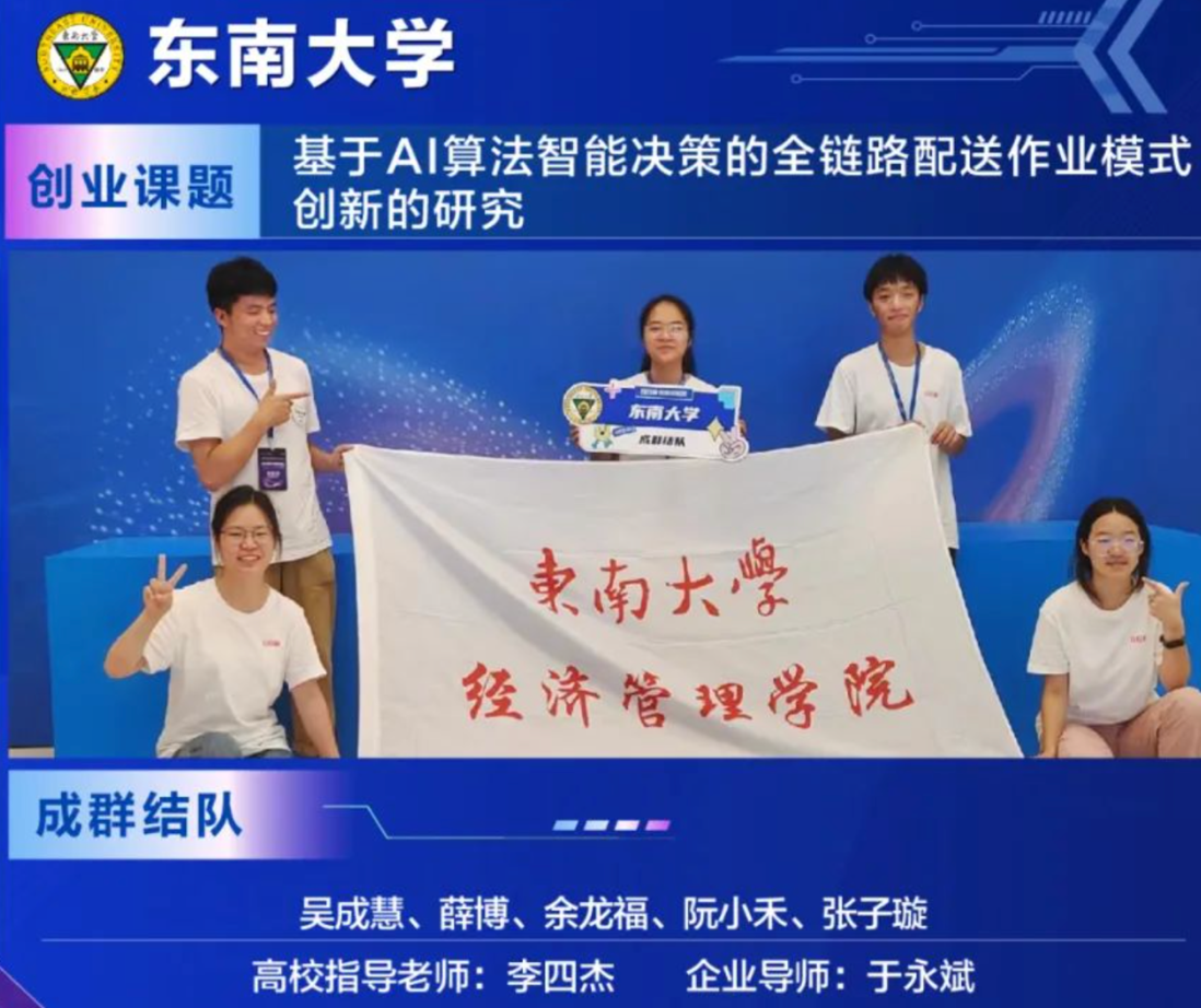 Our maker team's project "Research on Innovation of Full Chain Delivery Operation Mode Based on AI Algorithm Intelligent Decision" uses business process reengineering as the main means to build a process-oriented and visual operation platform consisting of "four modules, two algorithms, and one visualization system". Relying on industry and enterprise needs to promote innovative development, catering to customer needs, and creating personalized services, we have achieved the integration of multiple modules such as order allocation, pricing and order grabbing, performance scoring, and customer evaluation, solving the problems of low efficiency, lack of enthusiasm, and limited digital empowerment in the original distribution operation mode. Our maker team has received guidance and appreciation from professional judges and teachers for their excellent roadshow performance and attractive and innovative solutions, fully demonstrating the comprehensive quality and leading style of management pioneers of Southeast University.
