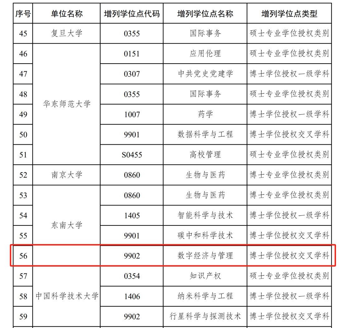 In September 2023, the Ministry of Education issued the Notice of the Academic Degrees Committee of the State Council on Issuing the List of Degree Authorization Points to be Revoked and Added by Degree Authorization Autonomous Audit Units in 2022 (Degree [2023] No. 15), which was considered and approved by the Academic Degrees Committee of the State Council and agreed that Southeast University would set up an additional doctoral degree-authorized interdisciplinary discipline in Digital Economy and Management.